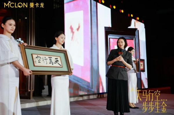 徐庆平手书作品赠送仪式 此次发布会的合作进一步凸显了曼卡龙的品牌策略。与北高峰文创的携手,旨在挖掘杭州本土文化IP,将深厚的地域特色文化底蕴和祈福内涵,用创新的、活化的方式呈现出来;让传统的“祈福”文化,变成年轻人乐于接受与分享的现代生活方式,从而实现文化传承与传播。与徐悲鸿美术馆的战略合作,则建立长效机制,从大师作品中汲取灵感,拓展联名系列。这些合作超越了简单的IP叠加,更强调精神共鸣与文化共创。在活动现场,徐悲鸿美术馆馆长杨净携徐悲鸿经典书法作品《天马行空》、画作作品《奔马(得势)》真迹亮相,杨净现场分享了作品创作背景与艺术价值,让在场嘉宾近距离感受大师作品的魅力,也为后续的联名合作奠定了深厚的艺术基调。 徐悲鸿美术馆馆长杨净将徐悲鸿之子徐庆平亲手题写的“天马行空-马年春联” 手书赠送给曼卡龙品牌,笔墨传递昂扬精神,也见证三方的深厚情谊。